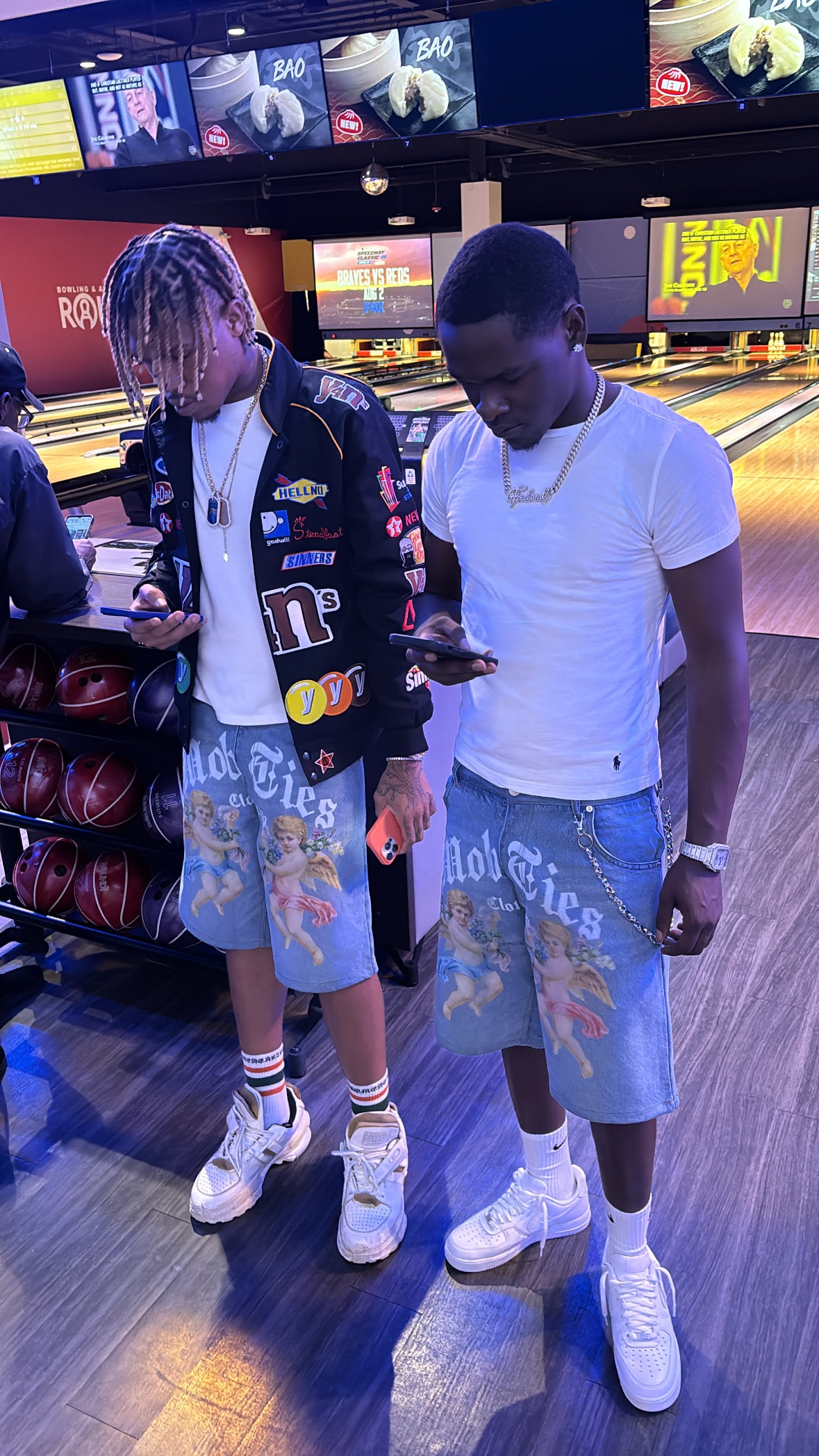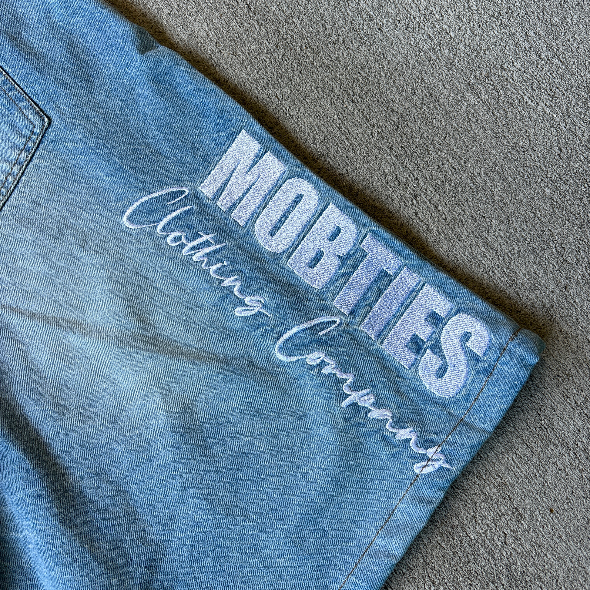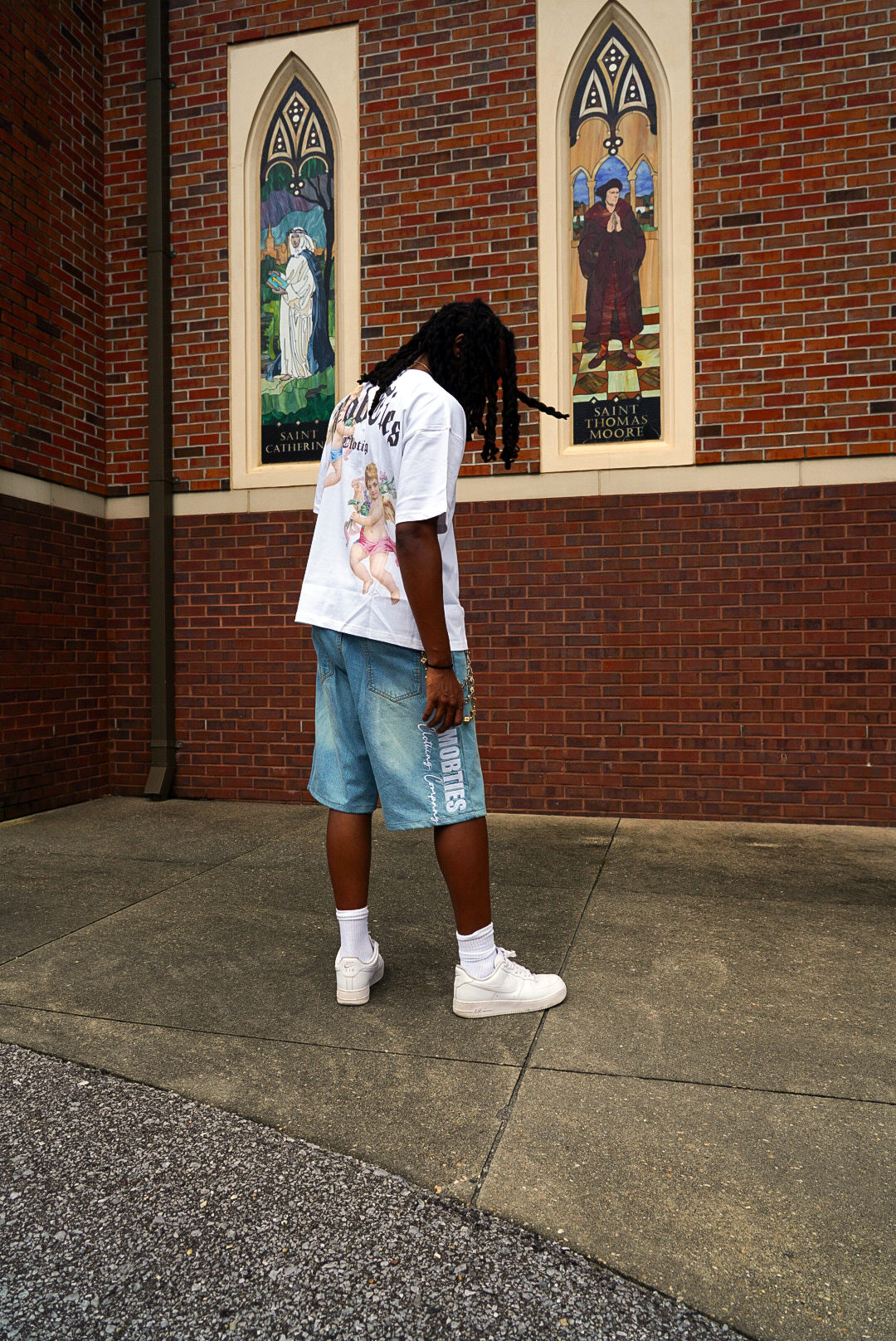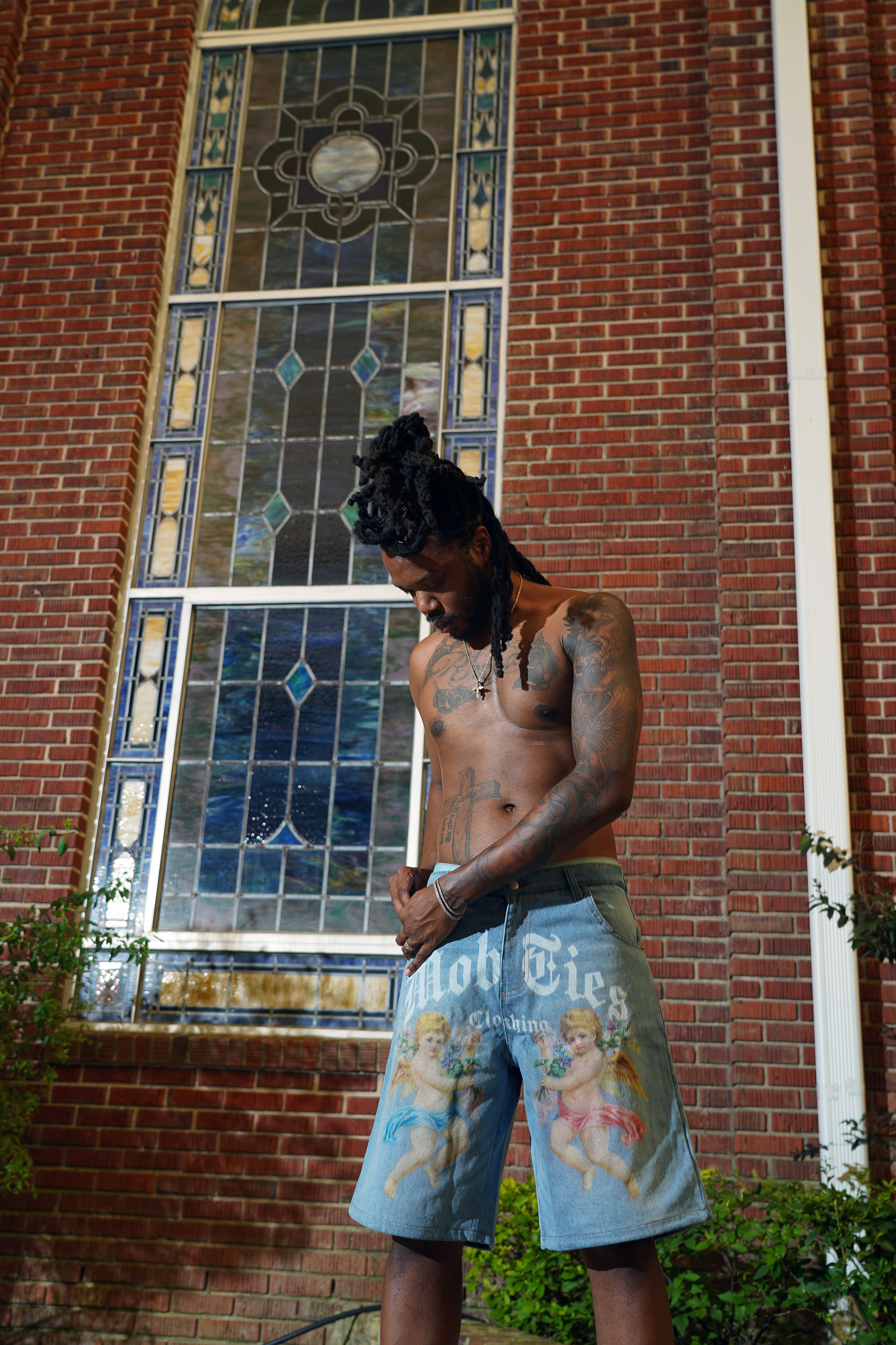 Light wash denim, angelic details. These shorts bring art to the streets with full-color DTG cherub prints and a standout “Mob Ties Clothing” DTG logo across the front. Embroidered Logos on back of denim.